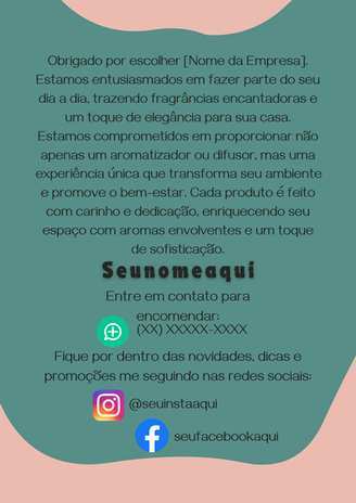 Quando um cliente perguntar sobre os seus AROMATIZADORES, impressione-o enviando um catálogo digital elegante e personalizado. Este catálogo não só detalha os tipos de produtos, aromas e designs que você oferece, mas também orienta como encomendar, permitindo que o cliente visualize o verdadeiro valor do seu trabalho.
